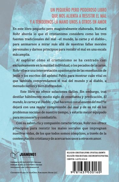 UN PEQUEÑO PERO PODEROSO LIBRO QUE NOS ALIENTA A RESISTIR EL MAL Y A TENDERNOS LA MANO UNOS A OTROS EN AMOR. En este libro pequeño pero magistralmente elaborado, Richard Rohr aborda lo que el cristianismo considera como las tres fuentes tradicionales del mal -el mundo, la carne y el diablo-, para animarnos a mirar más allá de nuestras fallas morales personales y darnos principios para resistir el mal en una escala más amplia. Al explorar cómo el cristianismo se ha centrado casi exclusivamente en la maldad individual, o los pecados de la carne, Rohr ofrece una interpretación apasionante de las enseñanzas de Jesús y los escritos del apóstol Pablo para mostrar cuán vital es que también comprendamos el mal del mundo y al diablo, a menudo sutiles y bien disfrazados. Este libro no ofrece soluciones fáciles. Sin embargo, tras destilar hábilmente medio siglo de enseñanza y predicación, El mundo, la carne y el Diablo : ¿Qué hacemos con el asunto del mal? te dejará con una mayor comprensión del mal y de su rol en los problemas sociales de nuestro tiempo, y estarás mejor equipado para reconocerlo y combatirlo. Con su sabiduría y compasión características, Rohr nos ofrece principios para resistir los males sociales que impregnan nuestras vidas, de los que todos somos cómplices, a través de la contemplación cristiana y de acercarnos unos a otros en amor.