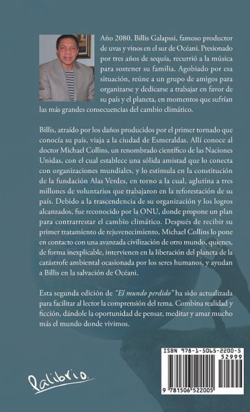 Año 2080. Billis Galapssi, famoso productor de uvas y vinos en el sur de Océani. Presionado por tres años de sequía, recurrió a la música para sostener su familia. Agobiado por esa situación, reúne a un grupo de amigos para organizarse y dedicarse a trabajar en favor de su país y el planeta, en momentos que sufrían las más grandes consecuencias del cambio climático. Billis, atraído por los daños producidos por el primer tornado que conocía su país, viaja a la ciudad de Esmeraldas. Allí conoce al doctor Michael Collins, un renombrado científico de las Naciones Unidas, con el cual establece una sólida amistad que lo conecta con organizaciones mundiales, y lo estimula en la constitución de la fundación Alas Verdes, en torno a la cual, aglutina a tres millones de voluntarios que trabajaron en la reforestación de su país. Debido a la trascendencia de su organización y los logros alcanzados, fue reconocido por la ONU, donde propone un plan para contrarrestar el cambio climático. Después de recibir su primer tratamiento de rejuvenecimiento, Michael Collins lo pone en contacto con una avanzada civilización de otro mundo, quienes, de forma inexplicable, intervienen en la liberación del planeta de la catástrofe ambiental ocasionada por los seres humanos, y ayudan a Billis en la salvación de Océani. Esta segunda edición de "El mundo perdido" ha sido actualizada para facilitar al lector la comprensión del tema. Combina realidad y ficción, dándole la oportunidad de pensar, meditar y amar mucho más el mundo donde vivimos.