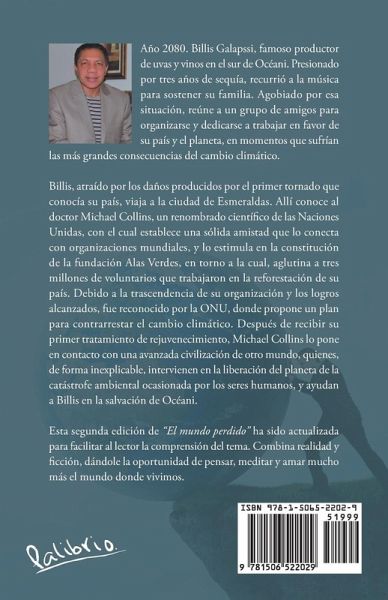Año 2080. Billis Galapssi, famoso productor de uvas y vinos en el sur de Océani. Presionado por tres años de sequía, recurrió a la música para sostener su familia. Agobiado por esa situación, reúne a un grupo de amigos para organizarse y dedicarse a trabajar en favor de su país y el planeta, en momentos que sufrían las más grandes consecuencias del cambio climático. Billis, atraído por los daños producidos por el primer tornado que conocía su país, viaja a la ciudad de Esmeraldas. Allí conoce al doctor Michael Collins, un renombrado científico de las Naciones Unidas, con el cual establece una sólida amistad que lo conecta con organizaciones mundiales, y lo estimula en la constitución de la fundación Alas Verdes, en torno a la cual, aglutina a tres millones de voluntarios que trabajaron en la reforestación de su país. Debido a la trascendencia de su organización y los logros alcanzados, fue reconocido por la ONU, donde propone un plan para contrarrestar el cambio climático. Después de recibir su primer tratamiento de rejuvenecimiento, Michael Collins lo pone en contacto con una avanzada civilización de otro mundo, quienes, de forma inexplicable, intervienen en la liberación del planeta de la catástrofe ambiental ocasionada por los seres humanos, y ayudan a Billis en la salvación de Océani. Esta segunda edición de "El mundo perdido" ha sido actualizada para facilitar al lector la comprensión del tema. Combina realidad y ficción, dándole la oportunidad de pensar, meditar y amar mucho más el mundo donde vivimos.