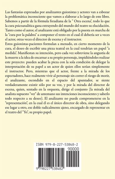 Las fantasías expresadas por analizantes guionistas y actores van a esbozar la problemática inconsciente que vamos a elaborar a lo largo de este libro. Sabemos a partir de la fórmula freudiana de la " Otra escena", todo lo que la cura psicoanalítica gana extrayendo del mundo del teatro su elucidación. Tanto como el autor, el analizante está obligado por la puesta en marcha de la "cura por la palabra" a componer el texto en el cual él debería ser a veces el actor, otras veces el director de escena y el instructor. Estos guionistas-pacientes formulan a menudo, en cierto momento de la cura, el deseo de escribir una pieza teatral en la cual tendrían un papel "a medida". Manifiestan su intención, pero cada vez sobreviene la angustia de la muerte a la idea de encarnar a su propio personaje, impidiéndoles realizar este proyecto: pueden acabar la pieza con la sola condición de delegar la interpretación de su papel a un actor de quien ellos serían simplemente el instructor. Pero, mientras que el actor, frente a la mirada de los espectadores, hace realmente vivir al personaje sin correr el riesgo de morir, el analizante, escondido en el espacio del apuntador, se siente verdaderamente existir sólo por su voz, y por la mirada del director de escena, quien, sentado en la orquesta, dirige el conjunto (la mirada del analista supuesto "ver" de antemano sus intenciones inconscientes y saberlo todo respecto a su deseo). El analizante no puede comprometerse en la "representación", en la cual él es el único director de obra, sino delegando ese lugar a otro, ese doble radicalmente ajeno, encargado de representar en el teatro del "Yo", su propio papel.