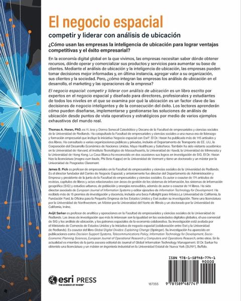 ¿Cómo usan las empresas la inteligencia de ubicación para lograr ventajas competitivas y el éxito empresarial? En la economía digital global en la que vivimos, las empresas necesitan saber dónde obtener recursos, dónde operar y comercializar sus productos y servicios para aumentar su base de clientes. Mediante el análisis de ubicación y la inteligencia de ubicación, una empresa puede tomar decisiones mejor informadas y, en última instancia, agregar valor a su organización, sus clientes y la sociedad. Pero, ¿cómo integran las empresas los análisis de ubicación en el desarrollo, el marketing y las operaciones de la empresa? En El negocio espacial: competir y liderar con análisis de ubicación se examina por qué la ubicación es un factor clave de las decisiones de negocio inteligentes y de la consecución del éxito. Los lectores aprenderán cómo pueden diseñarse, implementarse y gestionarse las soluciones de análisis de ubicación desde puntos de vista operativos y estratégicos por medio de varios ejemplos exhaustivos del mundo real. En cada capítulo de El negocio espacial se examina cómo las empresas reales han integrado la ubicación en su inteligencia de negocio y en la toma de decisiones. Algunos conceptos clave son: · Los fundamentos del negocio espacial y las tecnologías y métodos que permiten a las empresas entender la cadena de valor de ubicación · La creación de la arquitectura del negocio espacial para facilitar el análisis de ubicación en cumplimiento de las necesidades y metas empresariales · Los temas del negocio espacial y las implicaciones para la práctica Escrito por expertos en el negocio espacial y diseñado para directores, profesionales y estudiantes de todos los niveles, El negocio espacial proporciona una hoja de ruta para aprovechar el potencial de los datos geoespaciales en toda la cadena de valor de ubicación. The Spanish version of Spatial Business (2022) from Esri Press.