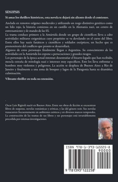 SINOPSIS Si amas los thrillers históricos, esta novela te dejará sin aliento desde el comienzo. Anclada en remotos orígenes medievales y utilizando un rasgo distintivo genético como un hilo rojo, la historia comienza en un castillo en la Alemania nazi, un centro de entrenamiento y de mando de las SS. La trama conduce primero a la Antártida donde un grupo de científicos lleva a cabo actividades militares enigmáticas cuyo propósito se va develando en el curso del libro. Entre ellos hay nazis fanáticos y científicos y soldados escépticos, un hecho que es premonitorio del conflicto que pronto se desarrollará. Algunos de estos personajes finalmente llegan a Argentina. Su conocimiento de las actividades en la Antártida los expone a persecuciones y grandes riesgos. Los personajes de la época actual intentan desentrañar el bizarro legado que han recibido, mezcla extraña de mitología nazi e intereses muy específicos. Esto los lleva enfrentar a hombres muy violentos y peligrosos. La acción se desplaza de Buenos Aires a Río de Janeiro y finalmente a una zona de bosques y lagos de la Patagonia hasta su dramática culminación. Vibrante thriller en toda su extensión.