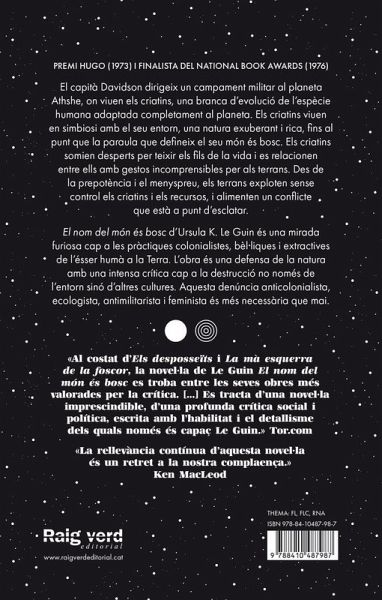 El capità Davidson dirigeix un campament militar al planeta Athshe, on viuen els criatins, una branca d?evolució de l?espècie humana adaptada completament al planeta. Els criatins viuen en simbiosi amb el seu entorn, una natura exuberant i rica, fins al punt que la paraula que defineix el seu món és bosc. Els criatins somien desperts per teixir els fils de la vida i es relacionen entre ells amb gestos incomprensibles per als terrans. Des de la prepotència i el menyspreu, els terrans exploten sense control els criatins i els recursos, i alimenten un conflicte que està a punt d?esclatar. El nom del món és bosc d?Ursula K. Le Guin és una mirada furiosa cap a les pràctiques colonialistes, bèl·liques i extractives de l?ésser humà a la Terra. L?obra és una defensa de la natura amb una intensa crítica cap a la destrucció no només de l?entorn sinó d?altres cultures. Aquesta denúncia anticolonialista, ecologista, antimilitarista i feminista és més necessària que mai.