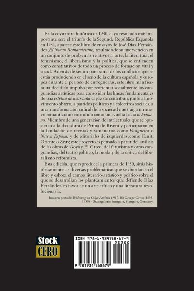 Within the historic events in the 1930's Spain, among whose most important outcome stands the triumph of the Spanish Second Republic (1931), Jose Diaz Fernandez released his book of essays, El Nuevo Romanticismo (The New Romanticism), a compendium of his observations on art, literature, feminism, liberalism, and politics, all five understood as parts of the vital and social processes. Besides being a panoramic scan of the issues that marked the Spanish and European culture during the period between wars, this book expresses a defined will to guide the artistic Avant Gardes and to consolidate the foundations of its aesthetics, with the intention of enabling them to contribute, alongside the labor movement, political parties and social collectives, to the radical transformations of a society bound to give birth to a new romanticism, understood as a return to the humane. As part of the generation who opposed the Primo de Rivera dictatorship, founded magazines and weeklies such as Postguerra or Nueva España, and leftwing publishing houses such as Cenit, Oriente or Zeus, this project is conceived departing from the analysis of the Goya and El Greco works, futurism and other avant garde expressions, as well as politics, fashion, and the critique of reformist liberalism. The present release, that reproduces the first 1930 edition, sets in an historic perspective the various issues discussed by Diaz Fernandez while sketching the literary and artistic backdrops that frame the author's stance in his quest for a critical art and a revolutionary literature.