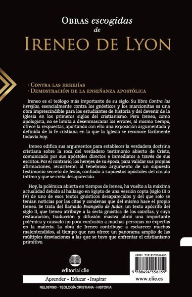 Ireneo, como apologista, no se limita a desenmascarar los errores, al mismo tiempo, ofrece la respuestas, aportando con ello una exposici¿¿n argumentada y definida de la fe cristiana en la que la Iglesia se reconoce f¿¿cilmente todav¿¿a hoy. - Contra las herej¿¿as - Desmostraci¿¿n de la ense¿¿anza apost¿¿lica Ireneo es el te¿¿logo m¿¿s importante de su siglo. Su libro Contra las herej¿¿as, esencialmente contra los gn¿¿sticos y los marcionitas es una obra imprescindible para los estudiantes de historia y del devenir de la iglesia en los primeros siglos del cristianismo. Pero Ireneo, como apologista, no se limita a desenmascarar los errores, al mismo tiempo, ofrece la respuesta, aportando con ello una exposici¿¿n argumentada y definida de la fe cristiana en la que la iglesia se reconoce f¿¿cilmente todav¿¿a hoy. Ireneo edifica sus argumentos para establecer la verdadera doctrina cristiana sobre la roca del verdadero testimonio abierto de Cristo, comunicado por sus ap¿¿stoles directos e inmediatos a trav¿¿s de sus escritos. Por el contrario, los herejes de su ¿¿poca, para validar sus propias afirmaciones, recurrieron al tenebroso argumento de un supuesto testimonio secreto de Jes¿¿s, confiado a supuestos ap¿¿stoles del c¿¿rculo ¿¿ntimo y que se cre¿¿a desaparecido. Hoy, la pol¿¿mica abierta en tiempos de Ireneo, ha vuelto a la m¿¿xima actualidad debido al hallazgo en Egipto de una versi¿¿n copta (siglo III o IV) de uno de esos textos gn¿¿sticos desaparecidos y de que solo se ten¿¿an noticias por las citas y condenas que del mismo hace el propio Ireneo. Se trata del llamado Evangelio de Judas, un texto ap¿¿crifo del siglo II, que Ireneo atribuye a la secta gn¿¿stica de los canan¿¿tas, y cuya restauraci¿¿n, traducci¿¿n y difusi¿¿n masiva abri¿¿ una importante pol¿¿mica y causado no poca confusi¿¿n a muchas personas no expertas en la materia. La obra de Ireneo contribuye a esclarecer muchos malentendidos, al tiempo que nos ofrece un panorama amplio de las m¿¿ltiples desviaciones as las que se tuvo que enfrentar el cristianismo primitvo.