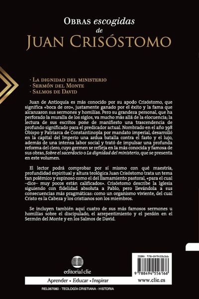 Juan Cris¿¿stomo trata un tema pol¿¿mico y espinoso: el llamamiento pastoral, ¿¿para el cual -dice- muy pocos est¿¿n calificados¿¿. Cris¿¿stomo describe la Iglesia siguiendo con fidelidad absoluta a Pablo, pero llev¿¿ndola a sus consecuencias m¿¿s pragm¿¿ticas: como un organismo viviente, del cual Cristo es la cabeza y los cristianos son los miembros. Juan de Antioqü¿a es m¿¿s conocido por su apodo Cris¿¿stomo. La lectura de sus escritos pone de manifiesto una trascendencia de profundo significado para el predicador actual. Desarroll¿¿ en la capital del Imperio una ardua batalla contra el fasto y el lujo, adem¿¿s de una intensa labor social y trat¿¿ de impulsar una profunda reforma del clero. Juan Cris¿¿stomo addresses a controversial and thorny theme: the pastoral call, "for which," he says, "very few are qualified". Cris¿¿stomo describes the Church following Paul's absolute fidelity, but bringing it to its most pragmatic consequences: as a living organism, of which Christ is the head and Christians are the members.