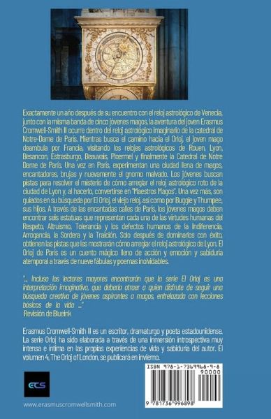 Exactamente un año después de su encuentro con el reloj astrológico de Venecia, junto con la misma banda de cinco jóvenes magos, la aventura del joven Erasmus Cromwell-Smith II ocurre dentro del reloj astrológico imaginario de la catedral de Notre-Dame de París. Mientras busca el camino hacia el Orloj, el joven mago deambula por Francia, visitando los relojes astrológicos de Rouen, Lyon, Besancon, Estrasburgo, Beauvais, Ploermel y finalmente la Catedral de Notre Dame de París. Una vez en París, experimentan una ciudad llena de magos, encantadores, brujas y nuevamente el gnomo malvado. Los jóvenes buscan pistas para resolver el misterio de cómo arreglar el reloj astrológico roto de la ciudad de Lyon y, al hacerlo, convertirse en "Maestros Magos". Una vez más, son guiados en su búsqueda por El Orloj, el viejo reloj, así como por Buggie y Thumpee, sus hijos. A través de las encantadas calles de París, los jóvenes magos deben encontrar seis estatuas que representan cada una de las virtudes humanas del Respeto, Altruísmo, Tolerancia y los defectos humanos de la Indiferencia, Arrogancia, la Sordera y la Traición. Solo después de dominarlos con éxito, obtienen las pistas que les mostrarán cómo arreglar el reloj astrológico de Lyon. El Orloj de París es un cuento mágico lleno de acción y emoción y sabiduría atemporal a través de nueve fábulas y poemas inolvidables. "... Incluso los lectores mayores encontrarán que la serie El Orloj ... es una interpretación imaginativa, una que debería atraer a cualquiera que disfrute de seguir una búsqueda creativa de jóvenes aspirantes a magos, entrelazada con lecciones básicas de la vida ..."Comentario de Blueink