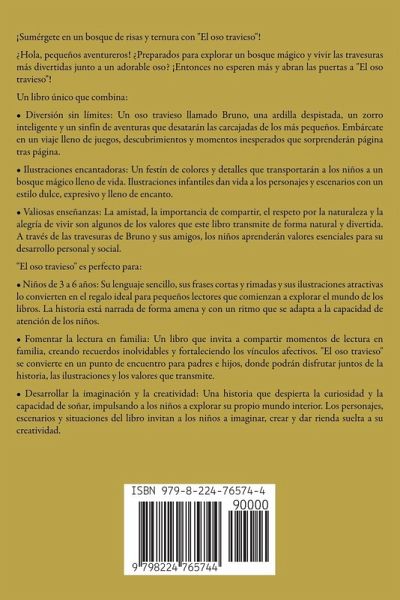 ¡Sumérgete en un bosque de risas y ternura con "El oso travieso"! ¿Hola, pequeños aventureros! ¿Preparados para explorar un bosque mágico y vivir las travesuras más divertidas junto a un adorable oso? ¡Entonces no esperen más y abran las puertas a "El oso travieso"! Un libro único que combina: ¿ Diversión sin límites: Un oso travieso llamado Bruno, una ardilla despistada, un zorro inteligente y un sinfín de aventuras que desatarán las carcajadas de los más pequeños. Embárcate en un viaje lleno de juegos, descubrimientos y momentos inesperados que sorprenderán página tras página. ¿ Ilustraciones encantadoras: Un festín de colores y detalles que transportarán a los niños a un bosque mágico lleno de vida. Ilustraciones infantiles dan vida a los personajes y escenarios con un estilo dulce, expresivo y lleno de encanto. ¿ Valiosas enseñanzas: La amistad, la importancia de compartir, el respeto por la naturaleza y la alegría de vivir son algunos de los valores que este libro transmite de forma natural y divertida. A través de las travesuras de Bruno y sus amigos, los niños aprenderán valores esenciales para su desarrollo personal y social. "El oso travieso" es perfecto para: ¿ Niños de 3 a 6 años: Su lenguaje sencillo, sus frases cortas y rimadas y sus ilustraciones atractivas lo convierten en el regalo ideal para pequeños lectores que comienzan a explorar el mundo de los libros. La historia está narrada de forma amena y con un ritmo que se adapta a la capacidad de atención de los niños. ¿ Fomentar la lectura en familia: Un libro que invita a compartir momentos de lectura en familia, creando recuerdos inolvidables y fortaleciendo los vínculos afectivos. "El oso travieso" se convierte en un punto de encuentro para padres e hijos, donde podrán disfrutar juntos de la historia, las ilustraciones y los valores que transmite. ¿ Desarrollar la imaginación y la creatividad: Una historia que despierta la curiosidad y la capacidad de soñar, impulsando a los niños a explorar su propio mundo interior. Los personajes, escenarios y situaciones del libro invitan a los niños a imaginar, crear y dar rienda suelta a su creatividad.