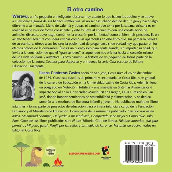 Werevu, un ñu pequeño e inteligente, observa muy atento lo que hacen los adultos y se atreve a cuestionar algunos de sus hábitos irreflexivos. Al no ser escuchado decide dar un giro y hacer algo diferente a su manada. Lleno de valentía y dudas, el camino que toma por la sabana africana es en realidad el de vivir de forma consciente, y éste lo lleva al encuentro con una constelación de animales diversos, cuyo rasgo común es la elección por la libertad como el bien más preciado. Es un acierto tener literatura con ideas críticas como las aparecidas en este libro que, sin perder la belleza de su escritura, ofrece a sus lectores la posibilidad de preguntarse si de verdad hay que pastar en los eternos prados de la costumbre. Éste es un cuento sólo para gente grande, sin importar su edad, que invita a la convicción de que el "gran sendero" es aquél que nos orienta hacia el corazón mismo de una vida solidaria y auténtica. El otro camino: la historia de un pequeño ñu forma parte de la colección de la autora Cuentos para despertar y enriquece la serie Otra escuela de Editora Educación Emergente.
