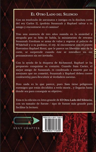 Con un trasfondo de asesinatos e intrigas en la disoluta corte del rey Carlos II, ¿podrán Susannah y Raphael salvar a su amigo y encontrarse en el camino? Tras una ausencia de tres años sumida en la ansiedad y atrapada por su falta de habla, la miniaturista de retratos Susannah Gresham se arma de valor y regresa al palacio de Whitehall y a su padrino, el rey. Al encontrarse con el joyero florentino Raphael Rossi, que le parece un libertino más de la corte, se sorprende cuando éste se introduce en sus pensamientos sin ser invitado. Con la ayuda de la duquesa de Richmond, Raphael se ha propuesto conquistar su corazón. Cuando Sam Carter, el mejor amigo de Susannah, es condenado a muerte por un asesinato que no cometió, Susannah y Raphael deben correr contrarreloj para descubrir al verdadero asesino. Pero nada es lo que parece, pues Sam tiene peligrosos enemigos que están decididos a verlo morir... y llegarán hasta donde sea para conseguir su objetivo. Esta es la edición en letra grande de El Otro Lado del Silencio, con un tamaño de fuente / tipo de fuente más grande para facilitar la lectura.