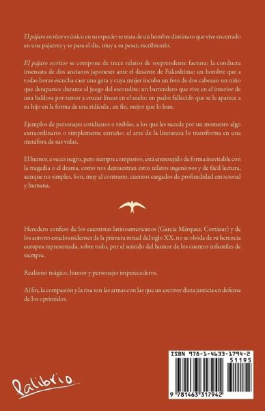 El pájaro escritor es único en su especie: se trata de un hombre diminuto que vive encerrado en una pajarera y se pasa el día, muy a su pesar, escribiendo. El pájaro escritor se compone de trece relatos de sorprendente factura: la conducta insensata de dos ancianos japoneses ante el desastre de Fukushima; un hombre que a todas horas escucha caer una gota y cuya mujer incuba un feto de dos cabezas; un niño que desaparece durante el juego del escondite; un barrendero que vive en el interior de una baldosa por temor a cruzar líneas en el suelo; un padre fallecido que se le aparece a su hijo en la forma de una ridícula..., en fin, mejor que lo lean. Ejemplos de personajes cotidianos o risibles, a los que les sucede por un momento algo extraordinario o simplemente extraño: el arte de la literatura lo transforma en una metáfora de sus vidas. El humor, a veces negro, pero siempre compasivo, está entretejido de forma inevitable con la tragedia o el drama, como nos demuestran estos relatos ingeniosos y de fácil lectura, aunque no simples. Son, muy al contrario, cuentos cargados de profundidad emocional y humana.