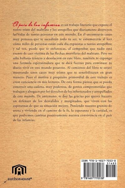 El país de las infamias es un trabajo literario que expone el rostro triste del maltrato y los atropellos que diariamente destruyen las vidas de tantas personas en este mundo. En él encontrarás casos muy penosos que te sacudirán todo tu ser, te estremecerás al leer cómo miles de personas están cada día expuestas a tantos atropellos; y tal vez, puede que te enfurezcas, al comprobar que nadie está exento de caer víctima de las flechas mortíferas del maltrato. Pero no sólo hallarás tristeza y desolación en este libro, también te expongo una formula esperanzadora que te dará fuerzas para continuar tu diario vivir en este mundo pesaroso. Al comienzo del libro te estaré mostrando unos casos muy tristes que te sensibilizaran en gran manera. Pues el motivo y propósito primordial de este trabajo es crear conciencia en mis lectores. De esta forma pienso que se pueda construir una cadena, muy poderosa, de gentes comprometidas que trabajen y aboguen por los derechos de los infortunados y atropellados de este mundo. De antemano, te doy las gracias por querer hacerte un defensor de los desvalidos y marginados, que viven con las esperanzas de que su situación mejore. Poniendo nuestro granito de arena y viviendo en el camino de la fe, la esperanza y la caridad, es que podremos cambiar positivamente nuestra convivencia en el país de las infamias.