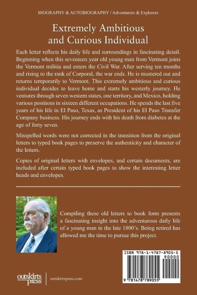 Each letter reflects his daily life and surroundings in fascinating detail. Beginning when this seventeen year old young man from Vermont joins the Vermont militia and enters the Civil War. After serving ten months and rising to the rank of Corporal, the war ends. He is mustered out and returns temporarily to Vermont. This extremely ambitious and curious individual decides to leave home and starts his westerly journey. He ventures through seven western states, one territory, and Mexico, holding various positions in sixteen different occupations. He spends the last five years of his life in El Paso, Texas, as President of his El Paso Transfer Company business. His journey ends with his death from diabetes at the age of forty seven. Misspelled words were not corrected in the transition from the original letters to typed book pages to preserve the authenticity and character of the letters. Copies of original letters with envelopes, and certain documents, are included after certain typed book pages to show the interesting letter heads and envelopes.