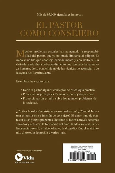 Muchos problemas actuales han aumentado la responsabiblidad del pastor, que ya no puede limitarse al p¿¿lpito. Es imprescindible que aconseje personalmente y con destreza. Su ¿¿xito depende ahora del entendimiento que tenga de la naturaleza humana, de su conocimiento de las t¿¿cnicas de aconsejar y de la ayuda del Espiritu Santo.Este libro fue escrito para: * Darle al pastor alugnos conceptos de psicolog¿¿a practica.* Presentar las principales t¿¿cnicas de consejeria pastoral* Proporcionar un estudio sobre los grandes problemas de la sociedad.¿¿C¿¿al es la soluci¿¿n cristiana a estos problemas? ¿¿C¿¿mo debe actuar el pastor en us funci¿¿n de consejero? El autor trata de contestar estas y otras preguntas, llevando al lector a trav¿¿s de temas variados y actuales: la formaci¿¿n del ni¿¿o, la adolecencia, la delincuencia juvenil, el alcholismo, la drogadicci¿¿n, el matrimonio, el sexo, la depresi¿¿n y varios m¿¿s.