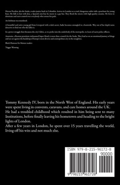 Hector Peculiar, aka the Snake, evades justice back in Colombia. Arrives in London as a cruel, dangerous sadist with a penchant for young boys. He falls in lust with Jose, a Spanish rent boy he meets in a gay bar. They flood the streets with high-quality cocaine. He loves to dominate and exert control over everybody who crosses his path. An Irishman was murdered. A beautiful and naïve young girl from Liverpool with a dark secret, Sadie becomes entangled in a homicide. Way out of her depth turns detective to find out who the killer is. In a power struggle that threatens the city's fabric, as we probe into the underbody of the metropolis, we learn of racist police officers. Anastasia, a Russian prostitute nicknamed Super Head, is more than a match for the Snake. They lead us on an emotional journey of drugs and sex set against the backdrop of Europe's most diverse and cosmopolitan city in the noughties. Black Humour for Mature readers Trigger Warning