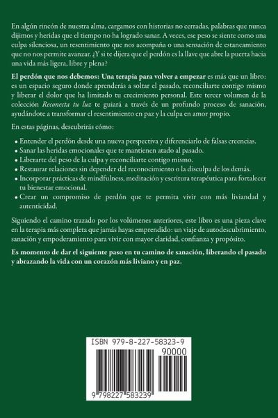 En algún rincón de nuestra alma, cargamos con historias no cerradas, palabras que nunca dijimos y heridas que el tiempo no ha logrado sanar. A veces, ese peso se siente como una culpa silenciosa, un resentimiento que nos acompaña o una sensación de estancamiento que no nos permite avanzar. ¿Y si te dijera que el perdón es la llave que abre la puerta hacia una vida más ligera, libre y plena? El perdón que nos debemos: Una terapia para volver a empezar es más que un libro: es un espacio seguro donde aprenderás a soltar el pasado, reconciliarte contigo mismo y liberar el dolor que ha limitado tu crecimiento personal. Este tercer volumen de la colección Reconecta tu luz te guiará a través de un profundo proceso de sanación, ayudándote a transformar el resentimiento en paz y la culpa en amor propio. En estas páginas, descubrirás cómo:Entender el perdón desde una nueva perspectiva y diferenciarlo de falsas creencias. Sanar las heridas emocionales que te mantienen atado al pasado. Liberarte del peso de la culpa y reconciliarte contigo mismo. Restaurar relaciones sin depender del reconocimiento o la disculpa de los demás. Incorporar prácticas de mindfulness, meditación y escritura terapéutica para fortalecer tu bienestar emocional. Crear un compromiso de perdón que te permita vivir con más liviandad y autenticidad. Siguiendo el camino trazado por los volúmenes anteriores, este libro es una pieza clave en la terapia más completa que jamás hayas emprendido: un viaje de autodescubrimiento, sanación y empoderamiento para vivir con mayor claridad, confianza y propósito. Es momento de dar el siguiente paso en tu camino de sanación, liberando el pasado y abrazando la vida con un corazón más liviano y en paz.