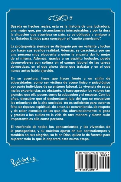 Basada en hechos reales, esta es la historia de una luchadora, una mujer que, por circunstancias inimaginables y por la dura la situación que atraviesa su país, se ve obligada a emigrar a los Estados Unidos para conseguir el "sueño americano". La protagonista siempre se distinguió por ser valiente y luchar por hacer sus sueños realidad. Además, se caracteriza por ser una persona muy elocuente a quien le encanta dar lo mejor de si misma. Además, gracias a su espíritu luchador, puede desenvolverse con soltura en el campo laboral de las tareas domésticas, en el que ahora tiene que trabajar y en el que nunca antes había ejercido. En su aventura, tiene que hacer frente a un sinfín de adversidades, como ser víctima de acoso físico y psicológico por parte individuos de su entorno laboral. La vivencia de estas malas experiencias, no obstante, le hace apreciar los valores tan grandes que ella posee, como la educación y el respeto. Con los años, descubre que el desbordante lujo del que se envuelven los miembros de la alta sociedad, no es suficiente para curar su falta de riqueza espiritual, de amor, de conveniencia, de respeto y de calor, esencias de las que ella, afortunadamente, sí goza y gracias a las cuales ve la vida de otra manera y siente cuán importante es ella como persona. El trasfondo de todos los pensamientos y las vivencias de la protagonista, y su máximo apoyo en sus contratiempos y también en sus alegrías, su fe en Dios, quien le da fuerzas para superar todo lo que le deparará esta nueva etapa.