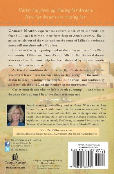 Carley has given up chasing her dreams. Now her dreams are chasing her. Carley Marek experiences culture shock when she visits her friend Lillian's family on their farm deep in Amish country. She'll get an article out of the visit--and maybe some of Lillian's newfound peace will somehow rub off on her. Just when Carley is getting used to the quiet nature of the Plain community, Lillian and Samuel's son falls ill. But the local doctor who can offer the most help has been shunned by the community and forbidden to intervene. As David's condition deteriorates, Dr. Noah determines to do whatever it takes to save the boy's life. Carley is caught in the middle--drawn to Noah, wanting to be helpful in the crisis--and confused by all their talk about a God she neither knows nor trusts. Carley must decide what in life is worth pursuing . . . and what to do when she's pursued by a love she never expected.