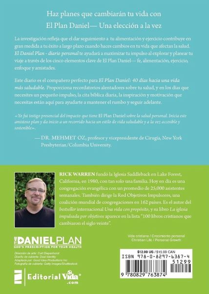 El Plan Daniel, Diario Personal de Rick Warren, Daniel Amen y Mark Hyman es mucho m¿¿s que un simple plan de dietas. Es una apetitosa estrategia para lograr un estilo de vida sano en el que se alienta a las personas a estar m¿¿s saludables optimizando las cinco claves esenciales: fe, alimentaci¿¿n, ejercicio, enfoque y amistades. El Plan Daniel te muestra como el concentrarte en la potente combinaci¿¿n de las cinco claves esenciales puede cambiar tu vida para siempre, decisi¿¿n a decisi¿¿n. Este libro te alentar¿¿ a profundizar en tu relaci¿¿n con Dios y desarrollar una comunidad de amigos de apoyo que te animar¿¿n a tomar decisiones sanas cada d¿¿a. El resultado: cambios graduales que transformar¿¿n tu vida de adentro hacia afuera. Contiene: Gü¿a pr¿¿ctica para un nuevo estilo de vida sano. Evaluaci¿¿n personal de ¿¿reas de bienestar. Evaluaci¿¿n de salud. Establecimiento de Metas SMART. Supervisi¿¿n y comprobaci¿¿n diaria de metas. The Daniel Plan Journal The Daniel Plan Journal by Rick Warren, Daniel Amen and Mark Hyman is so much more than a simple diet plan. It is an appetizing strategy to achieve a healthy lifestyle in which people are encouraged to be healthier, using the five essential keys: faith, food, fitness, focus, and friends. The Daniel Plan shows you how by concentrating on the powerful combination of the five essential keys you can change your life forever, decision by decision. This book will encourage you to deepen your relationship with God and develop a community of supportive friends who will encourage you to make healthy choices every day. The outcome: gradual changes that will transform your life from the inside out. It Contains: A practical guide to a new healthy lifestyle. Personal assessment of wellness areas. Health assessment. Setting of SMART Goals. Monitoring and daily checking of goals.
