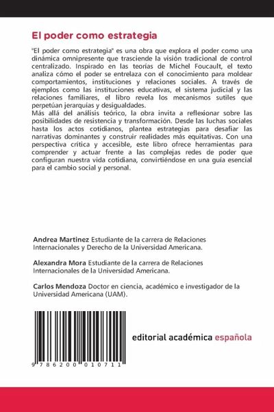 "El poder como estrategia" es una obra que explora el poder como una dinámica omnipresente que trasciende la visión tradicional de control centralizado. Inspirado en las teorías de Michel Foucault, el texto analiza cómo el poder se entrelaza con el conocimiento para moldear comportamientos, instituciones y relaciones sociales. A través de ejemplos como las instituciones educativas, el sistema judicial y las relaciones familiares, el libro revela los mecanismos sutiles que perpetúan jerarquías y desigualdades.Más allá del análisis teórico, la obra invita a reflexionar sobre las posibilidades de resistencia y transformación. Desde las luchas sociales hasta los actos cotidianos, plantea estrategias para desafiar las narrativas dominantes y construir realidades más equitativas. Con una perspectiva crítica y accesible, este libro ofrece herramientas para comprender y actuar frente a las complejas redes de poder que configuran nuestra vida cotidiana, convirtiéndose en una guía esencial para el cambio social y personal.