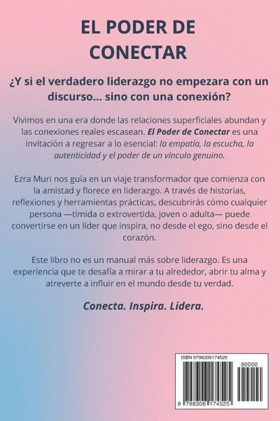 ¿Y si el verdadero liderazgo no empezara con un discurso... sino con una conexión? Vivimos en una era donde las relaciones superficiales abundan y las conexiones reales escasean. El Poder de Conectar es una invitación a regresar a lo esencial: la empatía, la escucha, la autenticidad y el poder de un vínculo genuino. Ezra Muri nos guía en un viaje transformador que comienza con la amistad y florece en liderazgo. A través de historias, reflexiones y herramientas prácticas, descubrirás cómo cualquier persona -tímida o extrovertida, joven o adulta- puede convertirse en un líder que inspira, no desde el ego, sino desde el corazón. Este libro no es un manual más sobre liderazgo. Es una experiencia que te desafía a mirar a tu alrededor, abrir tu alma y atreverte a influir en el mundo desde tu verdad. Conecta. Inspira. Lidera.