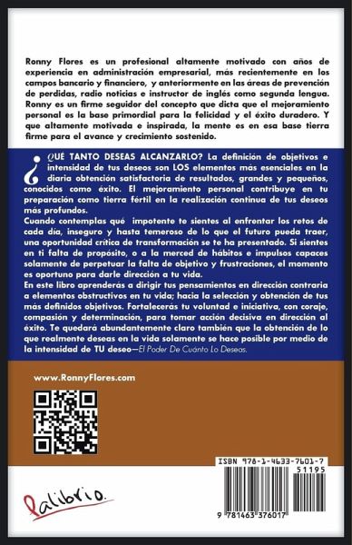 ¿QUÉ TANTO DESEAS ALCANZARLO? La definición de objetivos e intensidad de tus deseos son LOS elementos más esenciales en la diaria obtención satisfactoria de resultados, grandes y pequeños, conocidos como éxito. El mejoramiento personal contribuye en tu preparación como tierra fértil en la realización continua de tus deseos más profundos. Cuando contemplas qué impotente te sientes al enfrentar los retos de cada día, inseguro y hasta temeroso de lo que el futuro pueda traer, una oportunidad crítica de transformación se te ha presentado. Si sientes en ti falta de propósito, o a la merced de hábitos e impulsos capaces solamente de perpetuar la falta de objetivo y frustraciones, el momento es oportuno para darle dirección a tu vida. En este libro aprenderás a dirigir tus pensamientos en dirección contraria a elementos obstructivos en tu vida; hacia la selección y obtención de tus más definidos objetivos. Fortalecerás tu voluntad e iniciativa, con coraje, compasión y determinación, para tomar acción decisiva en dirección al éxito. Te quedará abundantemente claro también que la obtención de lo que realmente deseas en la vida solamente se hace posible por medio de la intensidad de TU deseo-El Poder De Cuánto Lo Deseas.