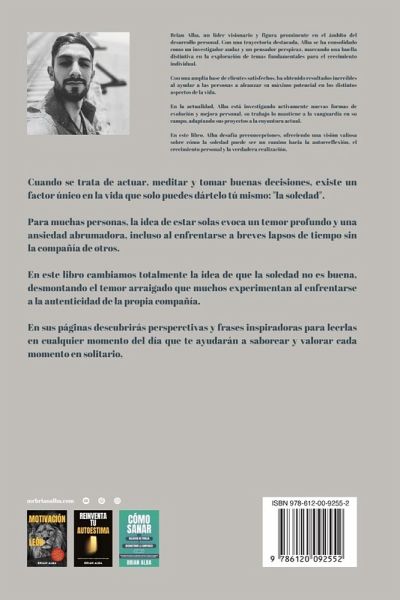 Cuando se trata de actuar, meditar y tomar buenas decisiones, existe un factor único en la vida que solo puedes dártelo tú mismo: "la soledad". Para muchas personas, la idea de estar solas evoca un temor profundo y una ansiedad abrumadora, incluso al enfrentarse a breves lapsos de tiempo sin la compañía de otros. En este libro recapitulamos y entramos a lo más profundo de las capas mentales del ser humano de una forma sencilla y práctica, cambiando totalmente la idea de que la soledad no es buena, desmontando el temor arraigado que muchos experimentan al enfrentarse a la autenticidad de la propia compañía. En sus páginas descubrirás una bomba de conceptos psicológicos analizados y explicados de una forma sencilla y práctica sobre la soledad y de lo implica estar solo, a su vez encontrarás frases inspiradoras para leerlas en cualquier momento del día que te ayudarán a saborear y valorar cada momento en solitario, transformándolos en oportunidades para potenciar no solo tu vida, sino también tus relaciones con el mundo que te rodea. También encontrarás ejemplos y consejos fáciles de incluir en tus días con los cuales tendrás un camino marcado que solamente deberás seguir para poder lograr todos tus sueños y anhelos. De ahora en adelante los momentos que compartas contigo mismo forjarán las raíces que moldeen tu carácter y tus pensamientos, proporcionándote serenidad incluso en las tormentas más intensas de la vida. El camino de la vida depende de cada persona y cada persona es el arquitecto de su propio destino. Sin embargo, ¿te sorprendería saber que la diferencia entre alguien que gana un millón de dólares y otro que gana cien puede residir en unas pocas horas de autenticidad consigo mismo? Y si te dijera que la clave entre aquellos que realizan sus sueños y los que no, puede radicar en cómo utilizan su tiempo en soledad Y si supieras que personas que han perdido todo en la vida han logrado transformar radicalmente sus vidas y alcanzar el éxito aprovechando el tiempo que pasan a solas... ¿Le pondrías más atención a los momentos que pases en soledad?