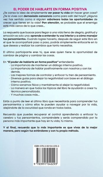 ¿Te cansa la idea de simplemente ver pasar tu vida sin hacer gran cosa? ¿Te la vives con demasiado cansancio como para salir del hoyo? ¿Alguna vez has sentido como si alguien saboteara todas las oportunidades de crecer que tienes en la vida? Pon atención, es probable que el enemigo esté más cerca de lo que crees... La respuesta que buscas para llegar a una vida llena de alegría, gratitud y emoción es solo una: aprende a entender tu voz interior y a cómo manejar tus pensamientos. Cuando logres hacerlo, después de seguir este libro en el que te acompañaré paso a paso, podrás simplemente enfocarte en lo que deseas y realizar los cambios que tanto necesitas. El último participante eres tú, que eres quien tiene la oportunidad de cambiar de página y cambiar las cosas. En "El poder de hablarte en forma positiva" entenderás: · La importancia de mantener un diálogo interno positivo. · La importancia de hablar positivamente con nosotros y con los demás. · Las mejores formas de controlar y enfocar tu tren de pensamiento. · Diversas guías para alejar la negatividad con base en el diálogo interno positivo. · Cómo sanamos física y mentalmente al alejar la negatividad. · La manera en que todos los tópicos del libro te ayudarán a crear tu técnica personalizada. · Y muchas cosas más... Estás a punto de leer el último libro que necesitarás para comprender tus pensamientos y cómo ellos te pueden ayudar a navegar por la vida, alejándote de la oscuridad que ronda en todos lados. Recuerda que puedes recuperar el control aprendiendo a enfocar tu cerebro y tus pensamientos, compréndete y serás comprendido por la persona más importante que hay en tu vida, tú mismo. Y al final, recuerda que lo más importante es que vivas de la mejor manera, pero según tus estándares y con tu propio método.