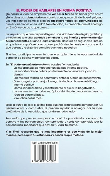 ¿Te cansa la idea de simplemente ver pasar tu vida sin hacer gran cosa? ¿Te la vives con demasiado cansancio como para salir del hoyo? ¿Alguna vez has sentido como si alguien saboteara todas las oportunidades de crecer que tienes en la vida? Pon atención, es probable que el enemigo esté más cerca de lo que crees... La respuesta que buscas para llegar a una vida llena de alegría, gratitud y emoción es solo una: aprende a entender tu voz interior y a cómo manejar tus pensamientos. Cuando logres hacerlo, después de seguir este libro en el que te acompañaré paso a paso, podrás simplemente enfocarte en lo que deseas y realizar los cambios que tanto necesitas. El último participante eres tú, que eres quien tiene la oportunidad de cambiar de página y cambiar las cosas. En "El poder de hablarte en forma positiva" entenderás: · La importancia de mantener un diálogo interno positivo. · La importancia de hablar positivamente con nosotros y con los demás. · Las mejores formas de controlar y enfocar tu tren de pensamiento. · Diversas guías para alejar la negatividad con base en el diálogo interno positivo. · Cómo sanamos física y mentalmente al alejar la negatividad. · La manera en que todos los tópicos del libro te ayudarán a crear tu técnica personalizada. · Y muchas cosas más... Estás a punto de leer el último libro que necesitarás para comprender tus pensamientos y cómo ellos te pueden ayudar a navegar por la vida, alejándote de la oscuridad que ronda en todos lados. Recuerda que puedes recuperar el control aprendiendo a enfocar tu cerebro y tus pensamientos, compréndete y serás comprendido por la persona más importante que hay en tu vida, tú mismo. Y al final, recuerda que lo más importante es que vivas de la mejor manera, pero según tus estándares y con tu propio método.