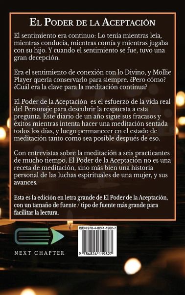 El sentimiento era continuo: Lo tenía mientras leía, mientras conducía, mientras comía y mientras jugaba con su hijo. Y cuando el sentimiento se fue, tuvo una gran decepción. Era el sentimiento de conexión con lo Divino, y Mollie Player quería conservarlo para siempre. ¿Pero cómo? ¿Cuál era la clave para la meditación continua? El Poder de la Aceptación es el esfuerzo de la vida real del Personaje para descubrir la respuesta a esta pregunta. Este diario de un año sigue sus fracasos y éxitos mientras intenta hacer una meditación sentada todos los días, y luego permanecer en el estado de meditación tanto como sea posible después de eso. Con entrevistas sobre la meditación a seis practicantes de mucho tiempo, El Poder de la Aceptación no es una receta de meditación, sino más bien una historia personal de las luchas espirituales de una mujer, y sus avances. Esta es la edición en letra grande de El Poder de la Aceptación, con una fuente / tipo de letra más grande para facilitar la lectura.