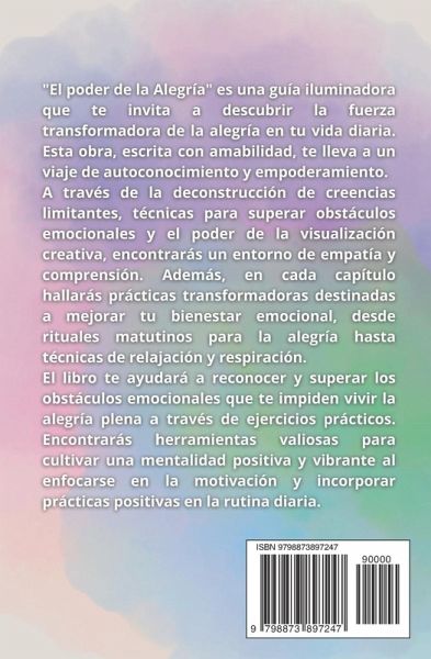 ¡Prepárate para desbloquear una vida llena de alegría! Con estas páginas comenzarás un viaje de autoconocimiento y empoderamiento, guiado por la amabilidad y la experiencia de Elaia. A través de la deconstrucción de creencias limitantes y el poderoso arte de la visualización creativa, descubrirás cómo transformar tu vida cotidiana en un oasis de alegría y plenitud. Cada página está impregnada de prácticas transformadoras diseñadas para mejorar tu bienestar emocional. Desde rituales matutinos que despiertan la alegría hasta técnicas de relajación y respiración que calman el alma, encontrarás un arsenal de herramientas valiosas para superar obstáculos emocionales y cultivar una mentalidad positiva y vibrante. ¿Estás lista para vivir una vida que brilla con luz propia?
