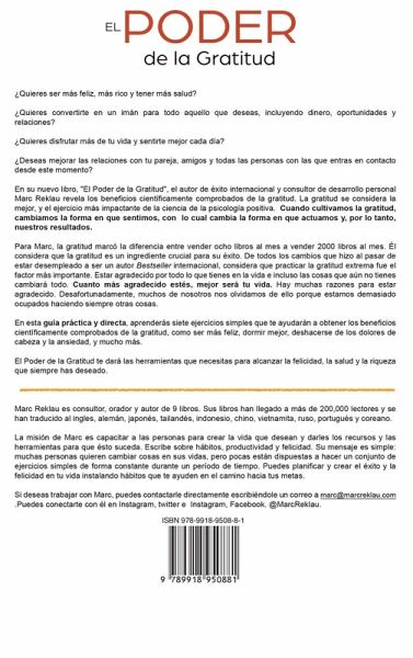 ¡La Gratitud funciona! ¿Quieres ser más feliz, más sano y más rico?¿Quieres convertirte en un imán para todo lo que deseas, incluyendo dinero, oportunidades y personas?¿Quieres disfrutar más de tu vida y sentirte mejor cada día?¿Desea mejorar las relaciones con tu cónyuge, tus amigos y todos los demás? En su nuevo libro, "El Poder de la Gratitud", el autor de Bestseller y consultor de desarrollo personal Marc Reklau revela los beneficios científicamente probados de la gratitud. La gratitud se considera la mejor y la más impactante intervención de la psicología positiva. Cuando cultivamos la gratitud, cambiamos la forma en que sentimos lo que cambia la forma en que actuamos y, por lo tanto, nuestros resultados. Estar agradecido por todo lo que tienes en la vida e incluso las cosas que aún no tienes cambiará tu vida. Si. Cuanto más agradecido estés, mejor será tu vida. En esta guía práctica y directa, aprenderás siete ejercicios simples que te ayudarán a obtener los beneficios científicamente comprobados de la gratitud, como ser más feliz, dormir mejor, deshacerte de los dolores de cabeza y la ansiedad, y mucho más. Encontrarás las herramientas que necesitas para alcanzar la felicidad, la salud y la riqueza que siempre has deseado. La gratitud te recarga de energía, aumenta tu autoestima y está directamente relacionada con el bienestar físico y mental. Te lleva directamente a la felicidad y es el mejor antídoto contra la ira, la envidia y el resentimiento. En este sencillo libro aprenderás:Que la gratitud es una elección y cómo elegirla conscientemente todos los días en cinco minutos o menos Cómo comenzar a sentir gratitud en tu vida de una manera real y simple. Exactamente cuándo y cómo practicar la gratitud para lograr los máximos resultados y beneficios. Cuánto tiempo tienes que estar agradecido cada día Cómo ser agradecido, incluso cuando crees que no tienes absolutamente nada por lo que estar agradecido Por qué la gratitud es el mejor antídoto contra la ira, la tristeza, la envidia y otras emociones dolorosas Cómo la gratitud impacta tus relaciones positivamente Cómo estar agradecido incluso en tiempos difíciles. Todo por lo que puedes estar agradecido en TU vida Un método simple para aumentar tu felicidad y disminuir la depresión Cómo aumentar aún más los efectos de la gratitud. ...y mucho más... La actitud de gratitud puede marcar la diferencia entre amar y odiar tu trabajo. Entre un matrimonio feliz y el divorcio. Entre una vida social satisfactoria o estar sentado solo en casa. No te dejes engañar por la simplicidad de los ejercicios que menciona Reklau. Realmente pueden cambiar tu vida. Y lo mejor es que puedes empezar poco a poco. Estos pequeños cambios con el tiempo causarán resultados significativos y mensurables. Aplica los consejos de este libro y tu vida nunca será la misma. Los beneficios son innumerables, y los resultados se mostrarán en todas partes. ¡Obtén tu copia hoy haciendo clic en el botón COMPRAR AHORA en la parte superior de esta página!
