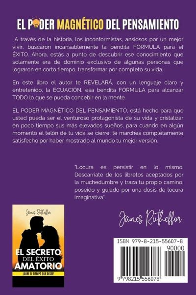 A través de la historia, los inconformistas, ansiosos por un mejor vivir, buscaron incansablemente la bendita FÓRMULA para el ÉXITO. Ahora, estás a punto de descubrir ese conocimiento que solamente era de dominio exclusivo de algunas personas que lograron en corto tiempo, transformar por completo su vida. En este libro el autor te REVELARÁ, con un lenguaje claro y entretenido, la ECUACIÓN, esa anhelada FÓRMULA para alcanzar TODO lo que se pueda concebir en la mente. El ÉXITO se PROGRAMA y sobre todo deja HUELLAS, deja pistas, y son precisamente esas huellas o pistas dejadas por las personas exitosas, las que se pueden recoger, analizar y adecuar a su situación, para que usted también alcance el éxito en un determinado campo. EL PODER MAGNÉTICO DEL PENSAMIENTO, está hecho para que usted pueda ser el venturoso protagonista de su vida y cristalizar en poco tiempo sus más elevados sueños, para cuando en algún momento el telón de tu vida se cierre, te marches completamente satisfecho por haber mostrado al mundo tu mejor versión.