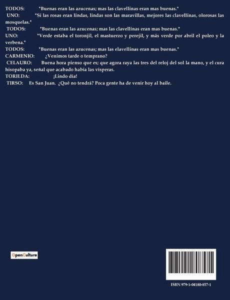 TODOS: "Buenas eran las azucenas; mas las clavellinas eran mas buenas." UNO: "Si las rosas eran lindas, lindas son las maravillas, mejores las clavellinas, olorosas las mosquelas." TODOS: "Buenas eran las azucenas; mas las clavellinas eran mas buenas." UNO: "Verde estaba el toronjil, el mastuerzo y perejil, y más verde por abril el poleo y la verbena." TODOS: "Buenas eran las azucenas; mas las elavellinas eran mas buenas." CARMENIO: ¿Venimos tarde o temprano? CELAURO: Buena hora pienso que es; que agora raya las tres del reloj del sol la mano, y el cura hisopaba ya, señal que acabado había las vísperas. TORILDA: ¡Lindo día! TIRSO: Es San Juan. ¿Qué no tendrá? Poca gente ha de venir hoy al baile.
