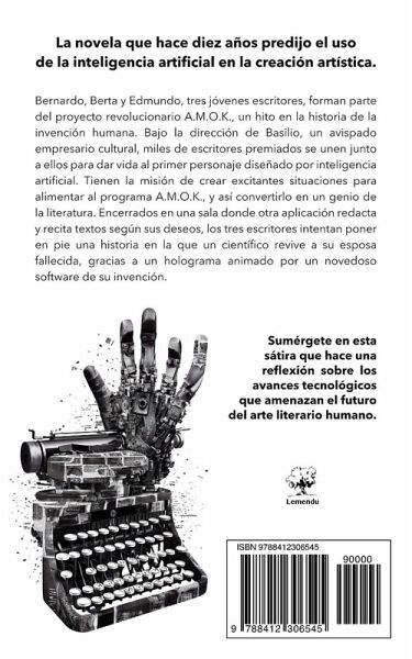 La novela que hace diez años predijo el uso de la inteligencia artificial en la creación artística. Bernardo, Berta y Edmundo, tres jóvenes escritores, participan en el proyecto A.M.O.K. que proclama ser un punto y aparte en la historia de la creación humana. Este sacadineros es la obra de Basilio, un empresario cultural que pretende crear el primer personaje fruto de la Inteligencia Artificial. Para ello, ha reunido a miles de escritores premiados en Sevilla. Ellos serán los encargados de suministrar situaciones excitantes para que el programa A.M.O.K. improvise sus reacciones, como si fuera un actor consumado. Además, en la sala en donde están reunidos, un programa redacta textos según la voluntad del usuario y los recita. Los tres escritores intentan poner en pie una historia en donde un científico revive a su esposa fallecida, gracias a un holograma animado por un novedoso programa de su invención. Edmundo piensa que, tras su brillante participación, todos se darán cuenta de que es un genio. Así que ha pagado la inscripción al proyecto con sus ahorros. Pero cada vez tiene más claro que ha cometido un error que lo llevará a la ruina. "El primer libro" es una novela satírica sobre la creación artística y las empresas tecnológicas que se sirven del capital humano para desarrollar sus herramientas. Hace diez años, muchos de sus pasajes avanzaron con fidelidad lo que es noticia hoy en día. Incluso en su trama hay un programa que redacta textos según la voluntad del usuario, a la manera de muchos chats creativos que están en boca de todos. Por ello, la editorial Lemendu se ha decidido a relanzar esta obra que ilumina un panorama que parece amenazar a los creadores del futuro.