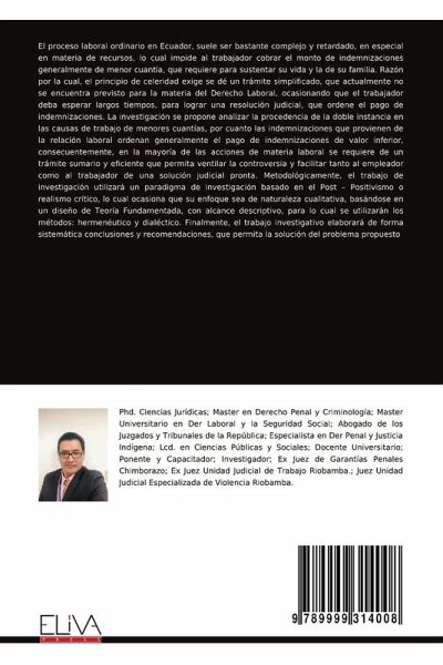 El proceso laboral ordinario en Ecuador, suele ser bastante complejo y retardado, en especial en materia de recursos, lo cual impide al trabajador cobrar el monto de indemnizaciones generalmente de menor cuantía, que requiere para sustentar su vida y la de su familia. Razón por la cual, el principio de celeridad exige se dé un trámite simplificado, que actualmente no se encuentra previsto para la materia del Derecho Laboral, ocasionando que el trabajador deba esperar largos tiempos, para lograr una resolución judicial, que ordene el pago de indemnizaciones. La investigación se propone analizar la procedencia de la doble instancia en las causas de trabajo de menores cuantías, por cuanto las indemnizaciones que provienen de la relación laboral ordenan generalmente el pago de indemnizaciones de valor inferior, consecuentemente, en la mayoría de las acciones de materia laboral se requiere de un trámite sumario y eficiente que permita ventilar la controversia y facilitar tanto al empleador como al trabajador de una solución judicial pronta. Metodológicamente, el trabajo de investigación utilizará un paradigma de investigación basado en el Post - Positivismo o realismo crítico, lo cual ocasiona que su enfoque sea de naturaleza cualitativa, basándose en un diseño de Teoría Fundamentada, con alcance descriptivo, para lo cual se utilizarán los métodos: hermenéutico y dialéctico. Finalmente, el trabajo investigativo elaborará de forma sistemática conclusiones y recomendaciones, que permita la solución del problema propuesto