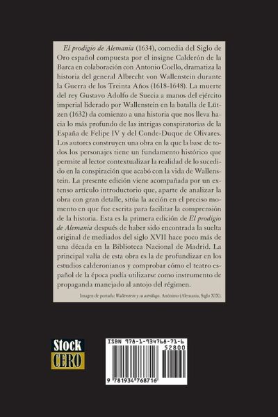 El prodigio de Alemania (1634), a Spanish Golden Age comedy written by Calderon de la Barca in collaboration with Antonio Coello, depicts the dramatic story of general Albrecht von Wallenstein during the Thirty Years War (1618-1648). The death of king Adolf Gustav of Sweden, during the Lützen battle (1632) against the imperial army led by Wallenstein, marks the start of a story that takes place within a dark conspiracy plot in the Spain of king Felipe IV and the Count-Duque of Olivares. The authors build a play with characters who all have historical references, thus displaying before the reader's eyes both the context and the events that marked the end of Wallenstein's life. This edition includes an extensive foreword and footnotes that, besides analyzing the play in detail, place the action in the precise historical moment in which it was written, thus facilitating the full comprehension of the story. This volume constitutes the first edition of El prodigio de Alemania after the original XVII Century unbound folios were found, less than ten years ago, in Madrid's National Library. The main value of this play is to delve deeper into the Calderonian studies and understand how the Spanish theatre of that period was used as political propaganda by the ruling regime.
