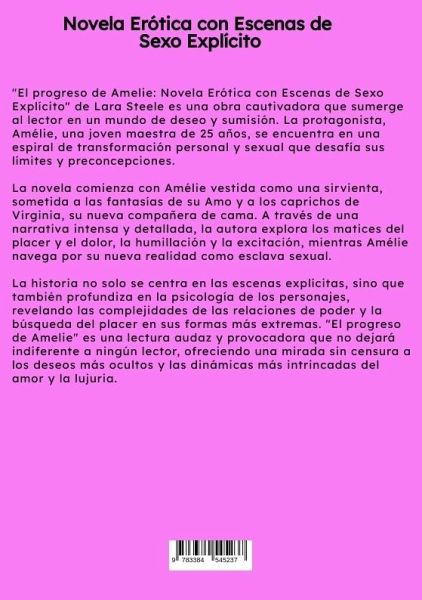 "El progreso de Amelie: Novela Erótica con Escenas de Sexo Explícito" de Lara Steele es una obra cautivadora que sumerge al lector en un mundo de deseo y sumisión. La protagonista, Amélie, una joven maestra de 25 años, se encuentra en una espiral de transformación personal y sexual que desafía sus límites y preconcepciones.La novela comienza con Amélie vestida como una sirvienta, sometida a las fantasías de su Amo y a los caprichos de Virginia, su nueva compañera de cama. A través de una narrativa intensa y detallada, la autora explora los matices del placer y el dolor, la humillación y la excitación, mientras Amélie navega por su nueva realidad como esclava sexual. La historia no solo se centra en las escenas explícitas, sino que también profundiza en la psicología de los personajes, revelando las complejidades de las relaciones de poder y la búsqueda del placer en sus formas más extremas. "El progreso de Amelie" es una lectura audaz y provocadora que no dejará indiferente a ningún lector, ofreciendo una mirada sin censura a los deseos más ocultos y las dinámicas más intrincadas del amor y la lujuria.