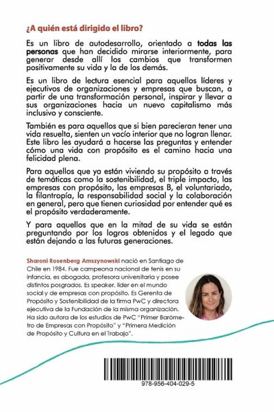 ¿Sientes que tienes el poder y deber de cambiar el mundo? ¿Anhelas generar un impacto positivo en la sociedad a través de tu trabajo, familia, o vida espiritual? ¿o sientes que pese a tenerlo todo en la vida -salud, éxito profesional, familia y dinero- aún hay un vacío que te impide alcanzar la plenitud? ¿Buscas inspirar y llevar a tu empresa por el camino del propósito? ¿Estás pensando en cuál será tu legado? ¿Sientes que ha llegado el momento de comenzar a vivir con mayor pasión, sentido, trascendencia y motivación? Este libro, inspirador y tremendamente humano, de una manera sencilla y práctica, te ayudará a identificar y encontrar tu camino al propósito, por medio del autoconocimiento y la reflexión, con el fin de descubrir cuál es tu lugar en el mundo, y cómo alcanzar una vida plenamente feliz. Existen distintos libros que hablan de la temática del propósito, pero siempre como parte de otro concepto como la confianza, la motivación, el sentido o la pasión.También existen filosofías como el Golden Circle de Simon Sinek o el Ikigai japonés que son excelentes herramientas pero que no terminan de explicar completamente lo que es el propósito, A esto se suma que las respuestas no se encuentran enteramente en una disciplina en particular como la psicología positiva, sociología, antropología, filosofía, teología o neurociencia, sino parcialmente en todas ellas. Todo lo anterior llevó a la autora a desarrollar su propia filosofía de vida y metodología. La bautizó como "telos" y permite ir adentrándose en el mundo del propósito desde su riqueza y complejidad. Para ello, rompe algunos paradigmas y prejuicios actuales para después desarrollar, lo que para ella son los cuatro elementos esenciales del telos: la autenticidad, la pasión, el sentido de la vida y la trascendencia. La autora busca demostrar con ciencia y evidencia que con la presencia de estos cuatros elementos, las personas experimentamos una transformación en nuestros valores, desatamos un potencial inimaginable y logramos descubrir la verdadera felicidad. Sharoni Rosenberg es autora de diversos estudios y conferencista de temas relacionados con el propósito. Se ha convertido en una especialista en la materia, es directora y asesora de distintas fundaciones y muy activa en el ecosistema de Empresas B en Sudamérica y profesora universitaria de impacto social. Ha sido autora de los estudios de PwC "Primer Barómetro de Empresas con Propósito" y "Primera Medición de Propósito y Cultura en el Trabajo", es profesora universitaria y además ha sido reconocida como una de las "100 Jóvenes Líderes" de Chile.