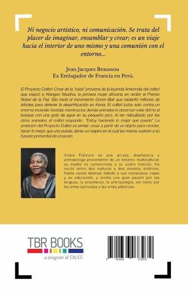 El Proyecto Colibrí: Crear de la "nada" proviene de la leyenda Amerindia del colibrí que inspiró a Wangari Maathai, la primera mujer africana en recibir el Premio Nobel de la Paz. Ella inició el movimiento Green Belt que replantó millones de árboles para detener la desertificación en Kenia. El colibrí lucha solo contra un enorme incendio forestal, mientras los demás animales lo observan volar del río al bosque con una gota de agua en su pequeño pico. Al ser ridiculizado por los otros animales, el colibrí responde... "Estoy haciendo lo mejor que puedo". La ambición del Proyecto Colibrí es similar: crear a partir de un objeto para reciclar, hacer lo mejor que uno pueda, darse un respiro en el cual las manos vuelven a su función primordial de creación.