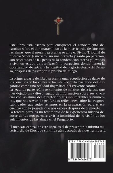 Este libro está escrito para enriquecer el conocimiento del católico sobre el don maravilloso de la misericordia de Dios con las almas, que al morir y presentarse ante el Divino Tribunal de nuestro Señor Jesucristo, sin una perfecta y santa preparación, son rescatadas de las penas de la condenación eterna y llevadas a vivir un estado de purificación o purgación, donde tienen la oportunidad de entrar a la plenitud de la gloria eterna del Paraíso, después de pasar por la so, prueba del fuego. La primera parte del libro presenta una recopilación de datos de los concilios en los cuales se ha establecido la existencia del Purgatorio como una realidad dogmática del creyente católico. La segunda parte reúne testimonios de místicos de la Iglesia que han dejado un valioso legado de información sobre sus vivencias con las almas del Purgatorio y sus innumerables sufrimientos, que nos sirven de profundas reflexiones sobre las responsabilidades que todos tenemos en la preparación para el encuentro con la jornada que nos espera después de la muerte. La tercera parte es un testimonio de la experiencia mística del autor donde nos permite vivir la intimidad de su visión de los sufrimientos de las almas en el Purgatorio. El mensaje central de este libro, es el de presentar la infinita misericordia de Dios que continua aún después de nuestra muerte.