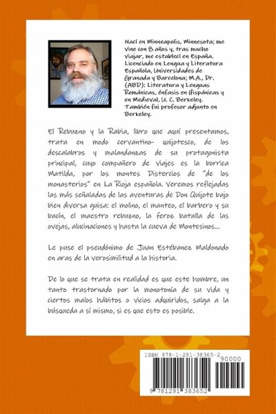 El Rebuzno y la Rabia, libro que aquí presentamos, trata en modo cervantino - quijotesco, de los descalabros y malandanzas de su protagonista principal, cuyo compañero de viajes es la borrica Matilda, por los montes Distercios "de los monasterios" en La Rioja española. Veremos reflejadas las más señaladas de las aventuras de Don Quijote bajo bien diversa guisa: el molino, el manteo, el barbero y su bacín, el maestro rebuzno, la feroz batalla de las ovejas, alucinaciones y hasta la cueva de Montesinos... Le puse el pseudónimo de Juan Estébanez Maldonado en aras de la verosimilitud de la historia. De lo que se trata en realidad es que este hombre, un tanto trastornado por la monotonía de su vida y ciertos malos hábitos o vicios adquiridos, salga a la búsqueda a sí mismo, si es que esto es posible. El libro es para desternillarse de risa, como lo es El Quijote, y como lo son Huckleberry Finn y La Conjura de los Necios. Kirk W. Wangensteen. Pseudónimo: Juan Estébanez, Maldonado