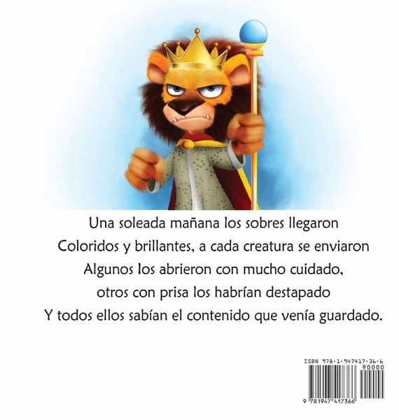 Enseña a los niños a tener paciencia: ******************* Una soleada mañana los sobres llegaron Coloridos y brillantes, a cada creatura se enviaron Algunos los abrieron con cuidado otros los habrían destapado Y todos ellos sabían el contenido que venía guardado. ********************************************************* ********************************************************* Serenity, HALL OF FAME TOP 10 REVIEWER 5.0 out of 5 stars~~Wonderful, just wonderful...~~ I can not imagine any child not enjoying this wonderful story... imaginative, delightful and a lesson in manners included. I feel that any book for the younger children (in this case ages 2 to 7 and P to 2) should contain colorful illustrations, rhyme and have a lesson for the little ones that is educational. This one contains all three elements and even at my advanced age, thought it was indeed wonderful. An invite to the lion king's birthday party sets this one into motion. The animals are truly excited and of course, the next item for them to ponder is 'what gift should I bring'? You see this lion king is well-known for his roaring ability when he is not happy. The animals gather at the palace and the fun begins. Nice things to eat and games to play... Finally it is gift time. I love the fact that each animal gives a little speech and incorporates something about their species...For example, the stork says 'May you dive in the pond to catch the best fish'... Unfortunately, the lion king is only interested in the gift each animal brings. The turtle is last and he teaches the lion king good manners and patience... Not an easy task but this cute and adorable turtle manages to succeed. Just love these books as they teach a lesson in addition to the rhyming aspect and the colorful illustrations. Most highly recommended.