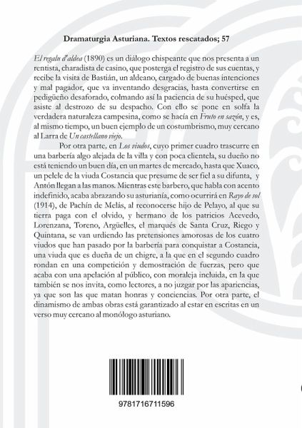 "El regalu d'aldea" (1890) es un diálogo chispeante que nos presenta a un rentista, charadista de casino, que posterga el registro de sus cuentas, y recibe la visita de Bastián, un aldeano, cargado de buenas intenciones y mal pagador, que va inventando desgracias, hasta convertirse en pedigüeño desaforado, colmando así la paciencia de su huésped, que asiste al destrozo de su despacho. Con ello se pone en solfa la verdadera naturaleza campesina, como se hacía en "Fruto en sazón", y es, al mismo tiempo, un buen ejemplo de un costumbrismo, muy cercano al Larra de "Un castellano viejo". Por otra parte, en "Los viudos", cuyo primer cuadro trascurre en una barbería algo alejada de la villa y con poca clientela, su dueño no está teniendo un buen día, en un martes de mercado, hasta que Xuaco, un pelele de la viuda Costancia que presume de ser fiel a su difunta, y Antón llegan a las manos. Mientras este barbero, que habla con acento indefinido, acaba abrazando su asturianía, como ocurrirá en "Rayo de sol" (1914), de Pachín de Melás, al reconocerse hijo de Pelayo, al que su tierra paga con el olvido, y hermano de los patricios Acevedo, Lorenzana, Toreno, Argüelles, el marqués de Santa Cruz, Riego y Quintana, se van urdiendo las pretensiones amorosas de los cuatro viudos que han pasado por la barbería para conquistar a Costancia, una viuda que es dueña de un chigre, a la que en el segundo cuadro rondan en una competición y demostración de fuerzas, pero que acaba con una apelación al público, con moraleja incluida, en la que también se nos invita, como lectores, a no juzgar por las apariencias, ya que son las que matan honras y conciencias. Por otra parte, el dinamismo de ambas obras está garantizado al estar en escritas en un verso muy cercano al monólogo asturiano.