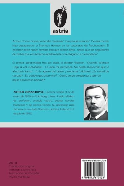 Arthur Conan Doyle pretendió "asesinar" a su propia creación. De esa forma, hizo desaparecer a Sherlock Holmes en las cataratas de Reichenbach. El escritor debe haber sentido eso que llaman alivio...hasta que los seguidores del detective reclamaron airadamente y lo obligaron a "resucitarlo". El primer sorprendido fue, sin duda, el doctor Watson. "Querido Watson -dijo la voz inolvidable-. Le pido mil perdones. No podía sospechar que le afectaría tanto ". Yo le agarre¿ del brazo y exclame¿: "¡Holmes! ¿Es usted de verdad? ¿Es posible que este¿ vivo? ¿Cómo se las arregló para salir de aquel espantoso abismo?"