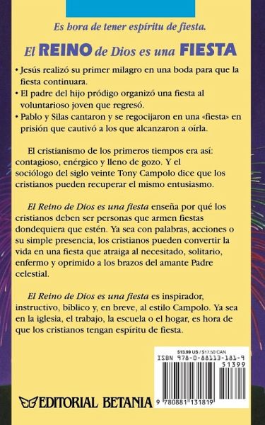 El cristianismo de los primeros tiempos era contagioso, energ¿¿tico y lleno de gozo. En El Reino de Dios es una fiesta, el soci¿¿logo Tony Campolo, ense¿¿a por qü¿ los cristianos deben ser las personas que armen fiestas dondequiera que est¿¿n. Ya sea con palabras, acciones o su simple presencia, los cristianos pueden convertir la vida en una fiesta que atraiga al necesitado, solitario, enfermo y oprimido a los brazos del amante Padre Celestial.