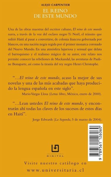 Una de las obras maestras del escritor cubano, El reino de este mundo narra, a trav s de la voz del esclavo negro Ti No l, el tr nsito que sufri Hait al pasar a convertirse, de colonia francesa gobernada por blancos, en una naci n negra regida por el primer monarca coronado del Nuevo Mundo. En una atm sfera lujuriosa y sensual que delata el ba rro quis mo y el realismo m gico de su autor, este relato nos permite conocer las rebeliones de Mackandal, las aventuras de Pauline Bonaparte, as como la tiran a del rey negro Henri Christophe. El reino de este mundo, acaso la mejor de sus novelas y una de las m s acabadas que haya pro du cido la lengua espa ola en este siglo . Mario Vargas Llosa (Letras libres, M xico, enero de 2000). Lean ustedes El reino de este mundo, y en con tra r n ah todas las claves de los sucesos de estos d as en Hait . Jorge Edwards (La Se gun da, 5 de marzo de 2004).
