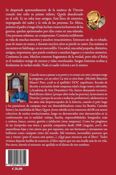 Se desprende apresuradamente de la muñeca de Vittorio cuando este sufre su primer infarto. Queda abandonado en el sofá. Se trata de un reloj muy antiguo. Está impregnado del sudor y la vida de las personas, y lleno de misterios. En África, primero el padre y luego el hijo luchan en los horrores de la guerra, atrapados en ella como en una tela de araña. Una promesa solemne, un compromiso. Continúa su vida de muchas muertes y muchos renacimientos. Entonces, un día, es robado y pasa de mano en mano, y durante muchos años se pierde su rastro. Esa mañana se encuentra en un mercadillo de Salzburgo. Una señal pequeña, antigua e importante que puede conducir a muchos lugares y misterios. Comienza la caza. Muchos conocen fragmentos de la verdad, pero solo el Reloj es el verdadero testigo de sucesos y vidas entrelazadas. Surgen historias ocultas y, finalmente, la verdad sale a la luz. Nada ni nadie volverá a ser lo mismo.