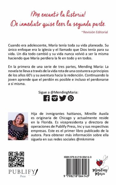 Cuando era adolescente, María tenía toda su vida planeada. Su único enfoque era la iglesia y el llamado que Dios tenía para su vida. Un día todo cambió y su vida nunca volvió a ser la misma haciendo que María perdiera la fe en todo y en todos. En la primera de una serie de tres partes, Mending Maria: La novela te lleva a través de la vida rota de una costurera a principios de los años 60's y su aventura hacia la redención. Continuando la joven aprende que el perdón es posible e incluso el perdonarse a sí misma.