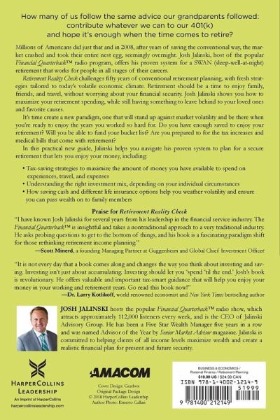 HOW TO RETIRE IN A VOLATILE MARKET Whether you have ten or thirty years until retirement, Josh Jalinski shows you how to maximize your retirement saving and spending plan, while still having something to leave behind for your family, friends, and favorite causes. Looking at your 401k in a volatile market can lead to panic and poor financial decisions. Even if you have already made some decisions you regret, or you waited until forty-five to think about retirement, there are steps you can take today that will help you reach your financial retirement goals. Josh Jalinski, host of the popular Financial Quarterback(TM) radio show, offers his SWAN (sleep-well-at-night) retirement that works for people in all stages of their careers. This proven system for secure retirement planning lets you enjoy your money, and teaches you: To challenge fifty years of conventional retirement planning with fresh strategies tailored to today's volatile economic climate. Tax-saving strategies that maximize the amount of money you have available to spend on experiences, travel, and expenses. Understanding how to identify the right investment portfolio mix for your individual circumstances. How saving cash and different life insurance options help you weather volatility and ensure you can pass wealth on to family members. The truth is, a 401(k) is not enough for most retirees. Its time create a new paradigm, one that will stand up against market volatility and be there when it's time to enjoy the years you worked to earn.